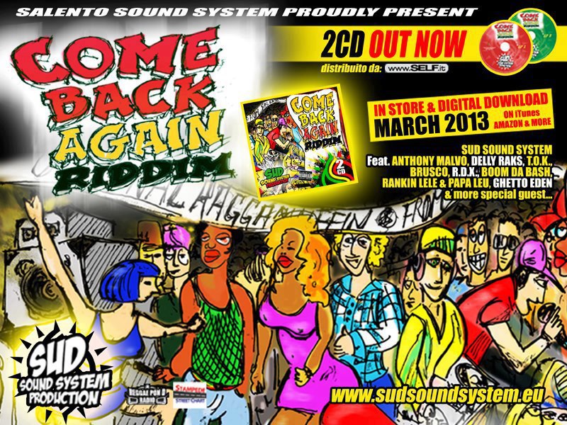 Salento Sound System proudly present: Come Back Again Riddim 2 cd in store e digital download da Marzo 2013. Sud Sound System feat. Anthony Malvo, Delly Ranx, T.o.k., Brusco, R.d.x., Boom Da bash, Rankin Lele & Papa Leu, Ghetto Eden & more special guest.