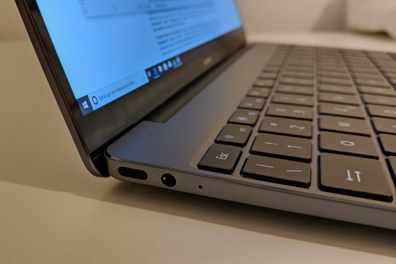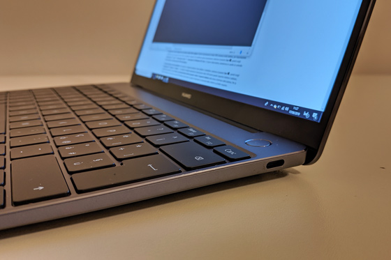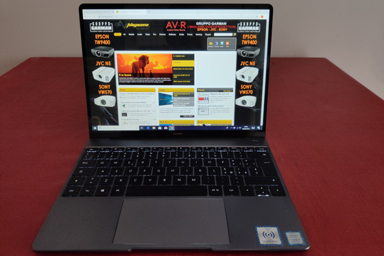 Le site affichage de 13 pouces couvre presque toute la surface avec un très petit cadre sur les côtés et le bord supérieur dans lequel est inséré un appareil photo de 1 mégapixel. Entre le cadre inférieur de l'écran et les boutons de fonction, deux haut-parleurs très efficaces avec traitement Dolby Atmos sont logés. Immédiatement à droite se trouve le grand bouton marche/arrêt, qui est aussi un lecteur d'empreintes digitales. Le Matebook 13 est légèrement plus épais et plus lourd que le Matebook X, peut-être en raison de la présence du système de dissipation thermique à double ventilateur.