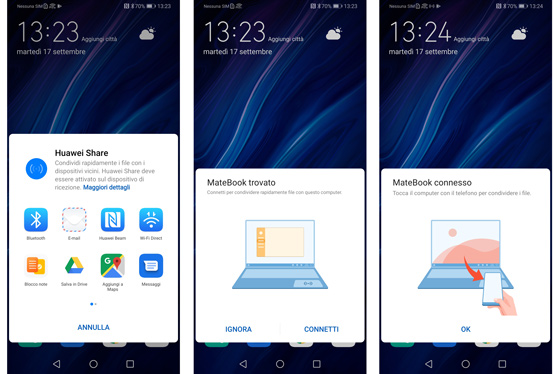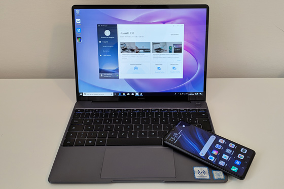 Le Matebook 13 est équipé de NFC et aussi de la suite logicielle “Partage de Huawei” qui te permet d'échanger des fichiers et plus encore avec les smartphones Huawei compatibles (environ 30 Huawei Mate, Huawei P et Honor) ; la liste complète se trouve à cette adresse. Après avoir configuré ton téléphone et ton ordinateur, tu pourras échanger des photos et des vidéos, des documents, faire des enregistrements d'écran et même échanger du texte avec. copier et coller du smartphone au PC de manière simple et immédiate, le tout en touchant la zone ‘NFC' identifiée par le logo ‘Huawei Share' avec le smartphone. Nous avons testé son fonctionnement avec un exemple du Huawei P30, et effectivement le système est rapide et fiable et permet de se passer du câble sans aucun regret.