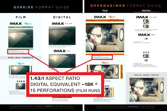 Oppenheimer n'a pas été produit exclusivement avec des négatifs 70 mm à 15 perforations avec un rapport d'aspect de 1,43:1 et de 1,43:1. la majorité du montage final est basée sur des négatifs à 5 perforations. avec un rapport hauteur/largeur de 2,20:1. Il s'agit toutefois d'un excellent progrès par rapport aux productions mixtes où les négatifs étaient utilisés 35mm quant à Dunkerque. Malheureusement, l'utilisation de la post-production analogique et de la correction des couleurs, a certainement… terni la qualité de l'image finale.