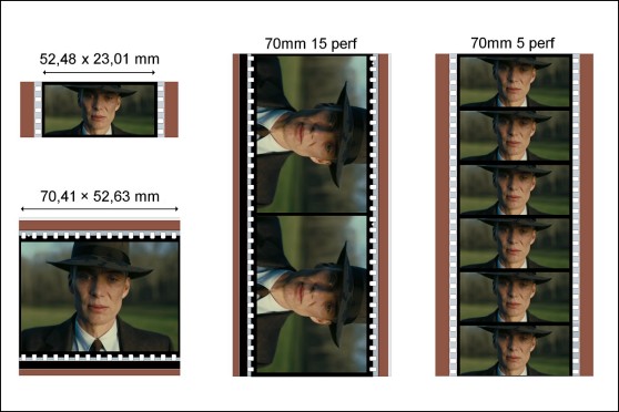 On lit qu'Oppenheimer a été abattu avec deux films différentsle film traditionnel de 70 mm à 5 perforations et le film IMAX de 70 mm à 15 perforations. Il s'agit d'un double canular: il n'y a pas de négatif IMAX! Le négatif provient de un seul format et fait 65 mm de large, et non 70 mm. Ce négatif, produit par Kodakpeut être utilisé dans différents appareils photo mais est toujours le même et identique support d'impression.