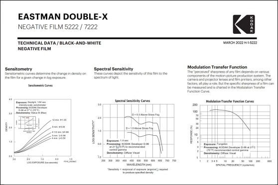 En parlant de pixel dans l'analyse de la résolution dans le domaine analogique est un étirement et on préfère utiliser le nombre de lignes par millimètre ou de paires de lignes par millimètre que l'on peut distinguer au microscope à une MTF (fonction de transfert de modulation) donnée, c'est-à-dire le nombre de lignes par millimètre que l'on peut distinguer au microscope à une MTF donnée. rapport de contraste minimum entre les lignes claires et les lignes sombres jusqu'à ce qu'on puisse encore les distinguer. Par convention, la limite de la valeur MTF est fixée à 20 %. Ci-dessus, tu peux voir les principales caractéristiques du négatif noir et blanc Kodak 5222.