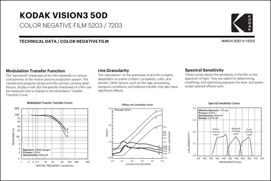 Il existe trois types de grains dans les films, un pour chaque composante de couleur, tous trois ayant des résolutions différentes. Par convention, lors de l'analyse de la résolution, seule la composante verte est prise en compte car elle représente la partie du spectre lumineux à laquelle nous sommes le plus sensibles. Les courbes MTF sont indiquées dans les fiches techniques des négatifs Kodak. Les trois courbes MTF pour les trois composantes de couleur ainsi que les autres paramètres principaux du négatif couleur Kodak sont illustrés ci-dessus. Vision 3 50D 5203.