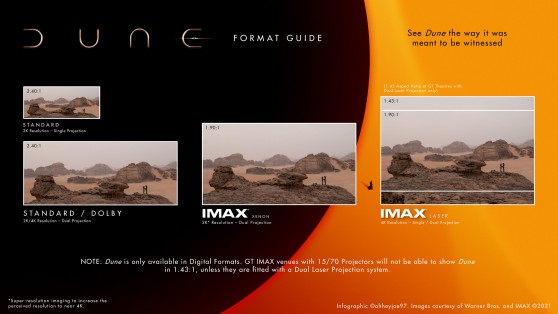Pour en revenir à la résolution, les systèmes de projection numérique conformes à la norme DCI qui reproduisent un film au format IMAX avec un rapport hauteur/largeur fixe de 2,20:1 sont crédités d'une résolution de 3998 x 1817 pixels (7,2 mégapixels) lors de la reproduction de la version “FLAT”. La résolution tombe à 3 775 x 1716 (6,5 mégapixels) avec des DCP au format SCOPE. Dans les meilleures salles IMAX équipées de projecteurs 4K, le film a pu être lu avec une résolution maximale de 4096×2160 (8,8 mégapixels) dans les scènes ayant un rapport hauteur/largeur de 1,89:1, tandis que la résolution tomberait à 4096 x 1861 (7,6 mégapixels) lorsque des scènes avec un rapport d'aspect de 2.20:1 sont projetées.