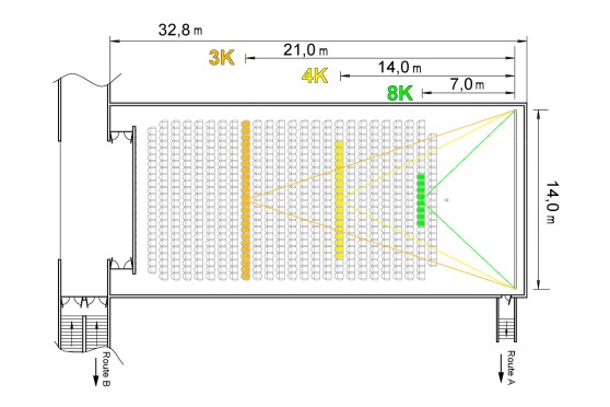 Mais fais aussi attention à ton position par rapport à l'écranSi tu es assis trop loin, tout ce que tu as lu dans cet article deviendra peu utile. Pour apprécier l'avantage théorique de la résolution dans les cinémas 70 mm par rapport au numérique 4K, tu devras t'asseoir à une distance inférieure à la base de l'écran au maximum. Si tu es assis à une distance égale à deux fois la base de l'image, alors la résolution perçue sera au maximum de 2K.