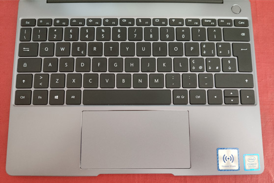 Le site affichage de 13 pouces couvre presque toute la surface avec un très petit cadre sur les côtés et le bord supérieur dans lequel est inséré un appareil photo de 1 mégapixel. Entre le cadre inférieur de l'écran et les boutons de fonction, deux haut-parleurs très efficaces avec traitement Dolby Atmos sont logés. Immédiatement à droite se trouve le grand bouton marche/arrêt, qui est aussi un lecteur d'empreintes digitales. Le Matebook 13 est légèrement plus épais et plus lourd que le Matebook X, peut-être en raison de la présence du système de dissipation thermique à double ventilateur.