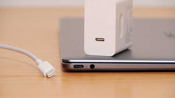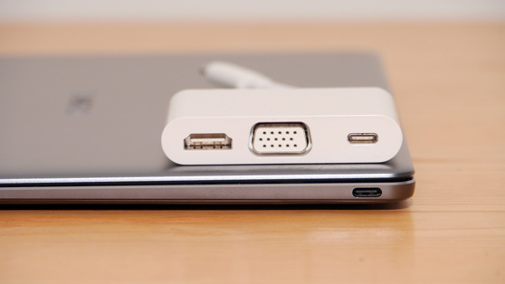 Les seuls connecteurs dont est équipé l'ultrabook Huawei sont un Minijack de 3,5 mm pour la sortie audio et l'entrée du microphone et deux connecteurs USB Type-C 3.1 situés latéralement sur le corps de l'appareil. Le connecteur de gauche est utilisé pour l'alimentation et le transfert de données ; celui de droite sert au transfert de données et aux connexions vidéo (HDMI, DisplayPort). Au connecteur de droite, il est possible de connecter un Hub, le MateDock 2, équipé d'un connecteur USB standard, d'un connecteur USB Type-C, d'un connecteur VGA et d'un connecteur HDMI. L'emballage de l'appareil que nous avons analysé, en plus du Matebook X, comprend également le MateDock 2, un chargeur Huawei MateBook 65 W (5V/2A, 9V/2A,12V/2A, 15V/3A, 20V/3,25A) et un petit manuel d'instructions.